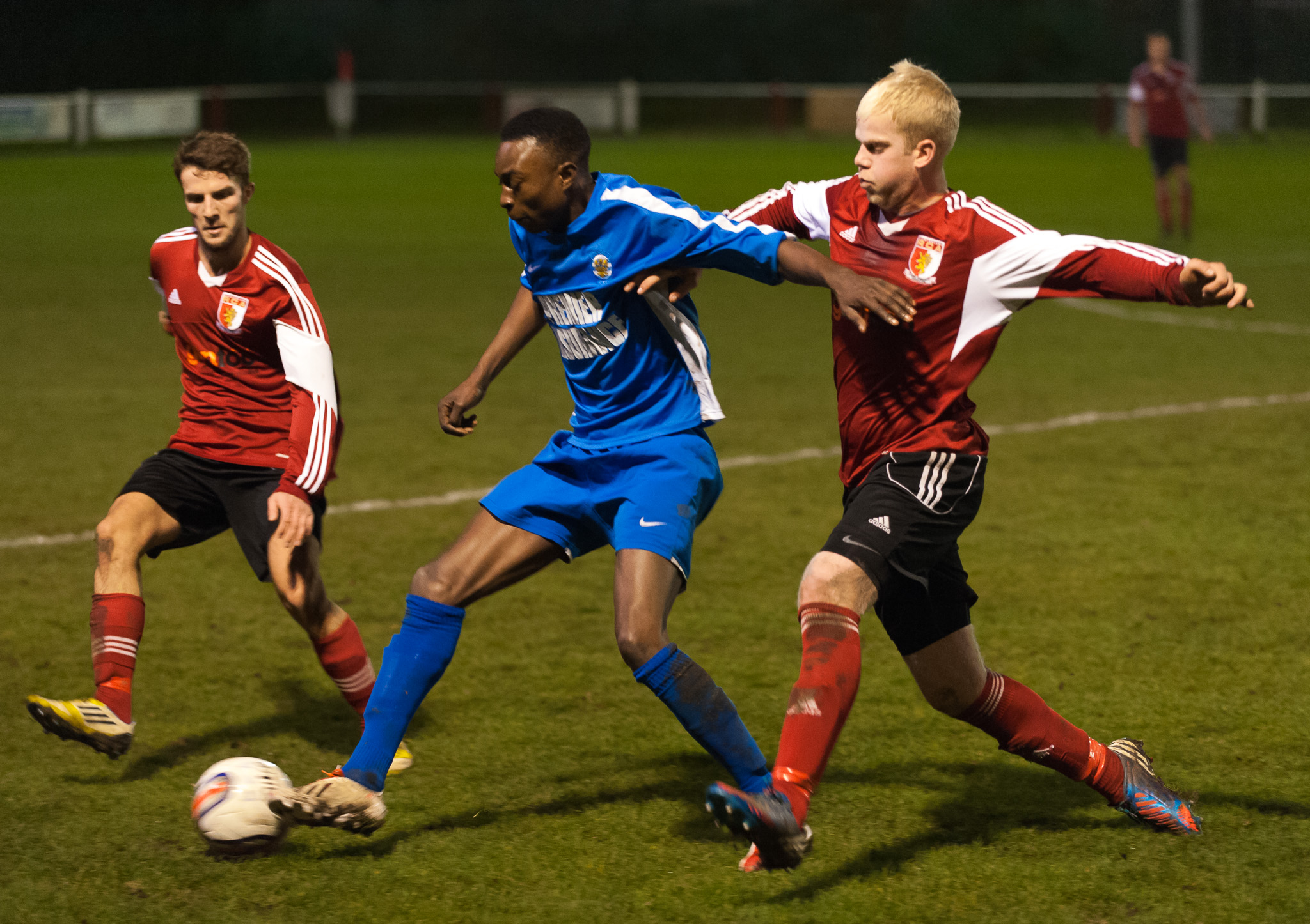 Aristote Guerin-Lokonga, returning to Meadow Park for the first time since his move to Consett, finds his options limited by RCA's Philip Horsman and Steven Baynes.