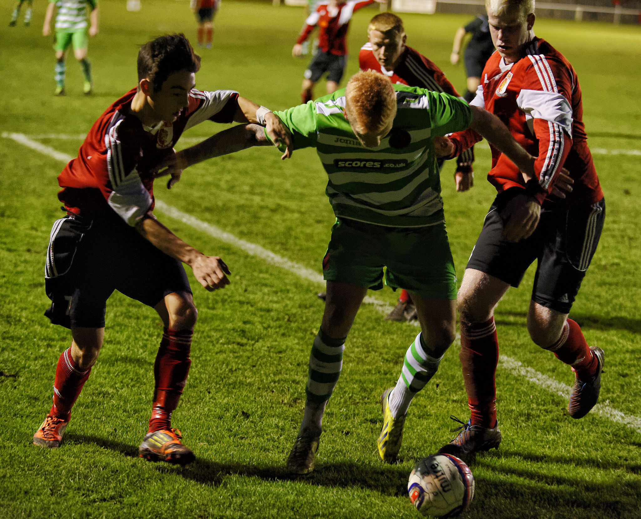 RCA's Kyle Fryatt and Phil Horsman combine to crowd out the Celtic Nation forward.