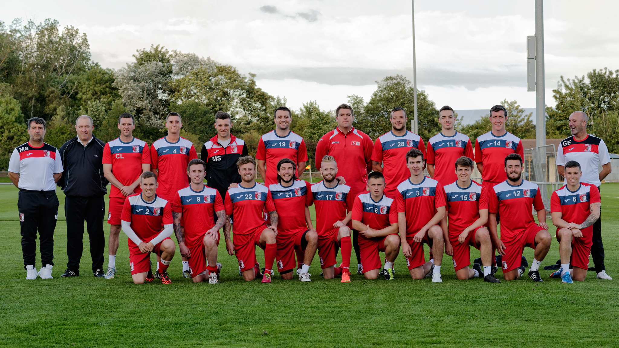 Back row, left to right, Martin Swales (Manager), Ian Smith (Coach), Colin Larkin (Player Coach), Andrew Brown, Ross McNab, Wayne Buchanan, Carl Morris, Adam Drysdale, Stephen Callen, Clifford Byrne, Gary Errington (Assistant Manager)