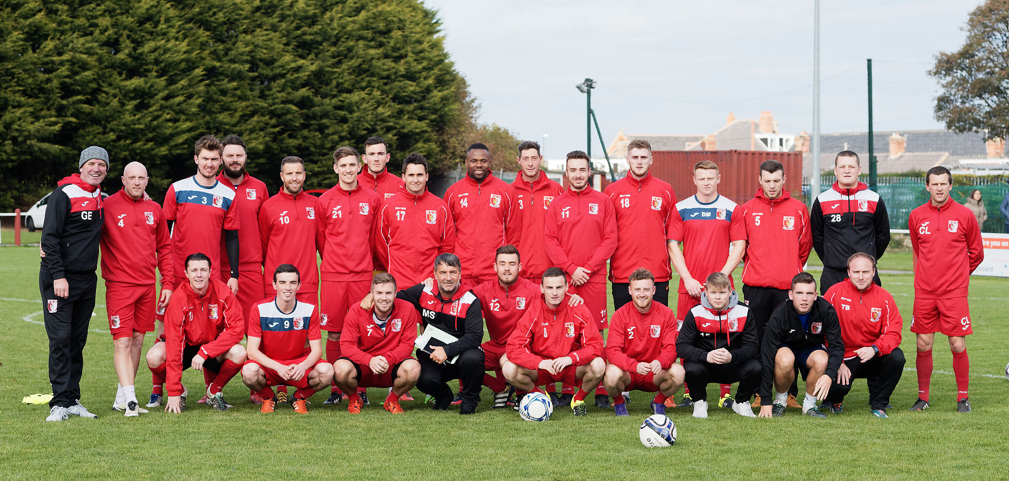 Back row, left to right: Gary Errington (coach), Steven Stewart (assistant manager), James Armstrong, Adam McGuinness, John Butler, Craig Hodgson, Sam Guthrie, Kevin Gordon, Callum Hassan, Greg Swansbury, Stephen Callen, Jordan Harkess, Ross Preston, Ross McNab, Neal Bussey, Colin Larkin (player/coach